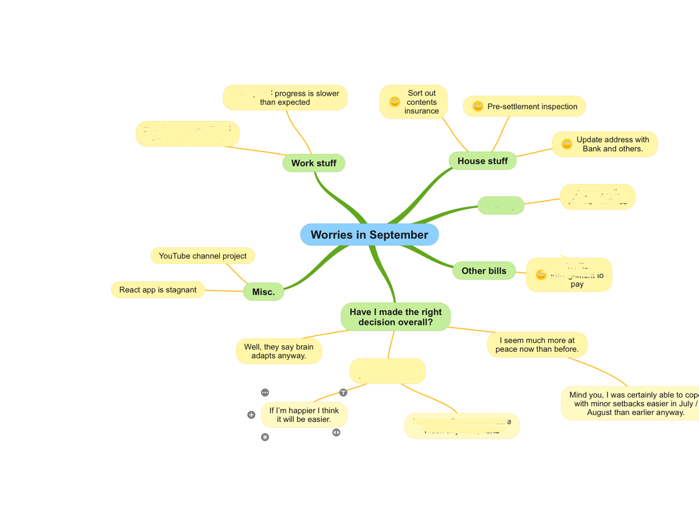 Each month, I start a new brainstorming session with the main topic as “worries in <month name, year>”. Then I can let my mind show me its worries (or they might be at front of mind), and I branch then off the central theme. Then I try to dig deeper into each worry or concern, to find out what are the actual issues I’m feeling. After this I can branch off each specific concern and I can try to find some solutions to those problems or resolve that it actually isn’t as bad as I thought.
