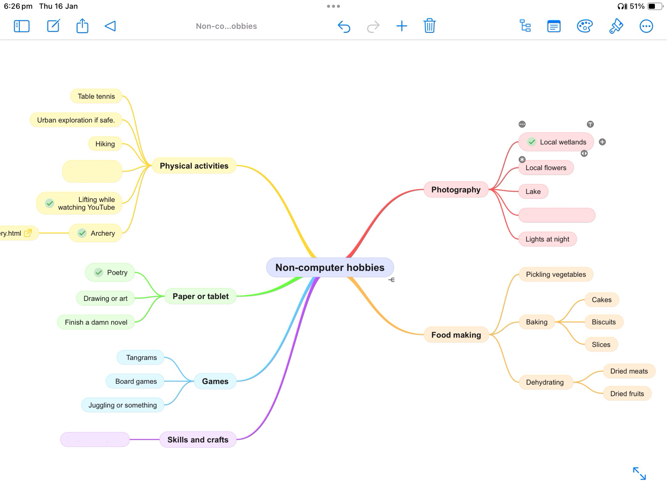 I also used it for brainstorming new hobbies by starting a branch for each kind of activity or category, then branching again for specific activities then if needed again further for details like location or food.