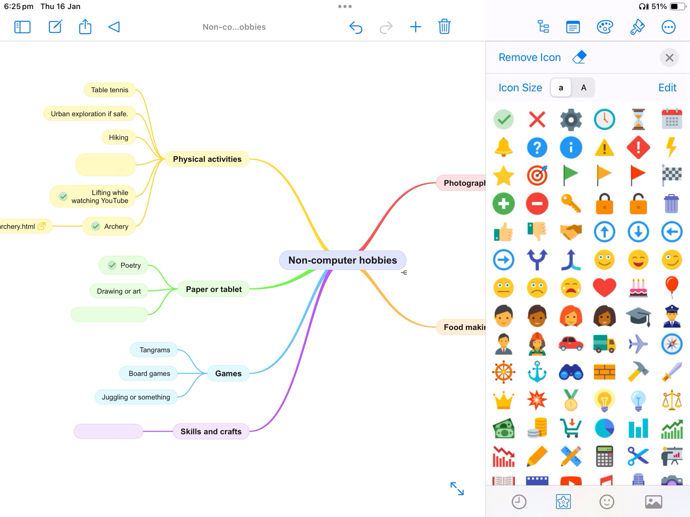 There is a button on each node that you can insert an emoji at the start of the node, and the paid version has heaps of emojis you can choose from (the free version only has a handful). I use these on my monthly feeling and thought discovery sessions so I can tick off a problem after I’ve solved it. But of course, you can use it for categories of hobbies or packing or events, it’s up to you!