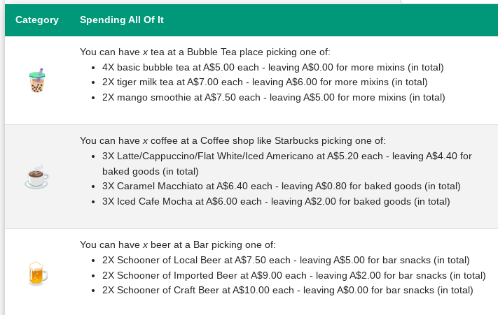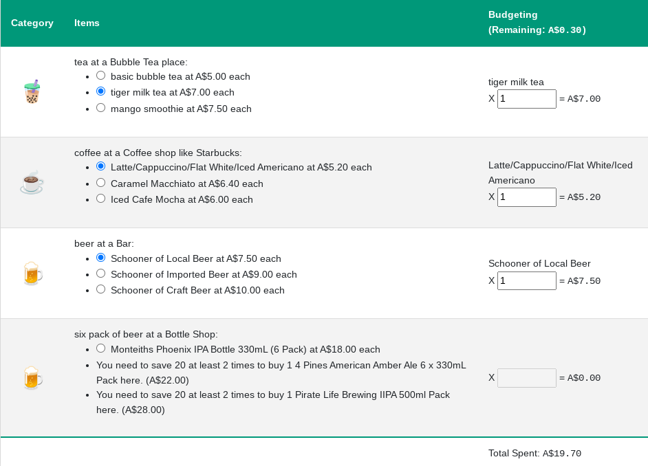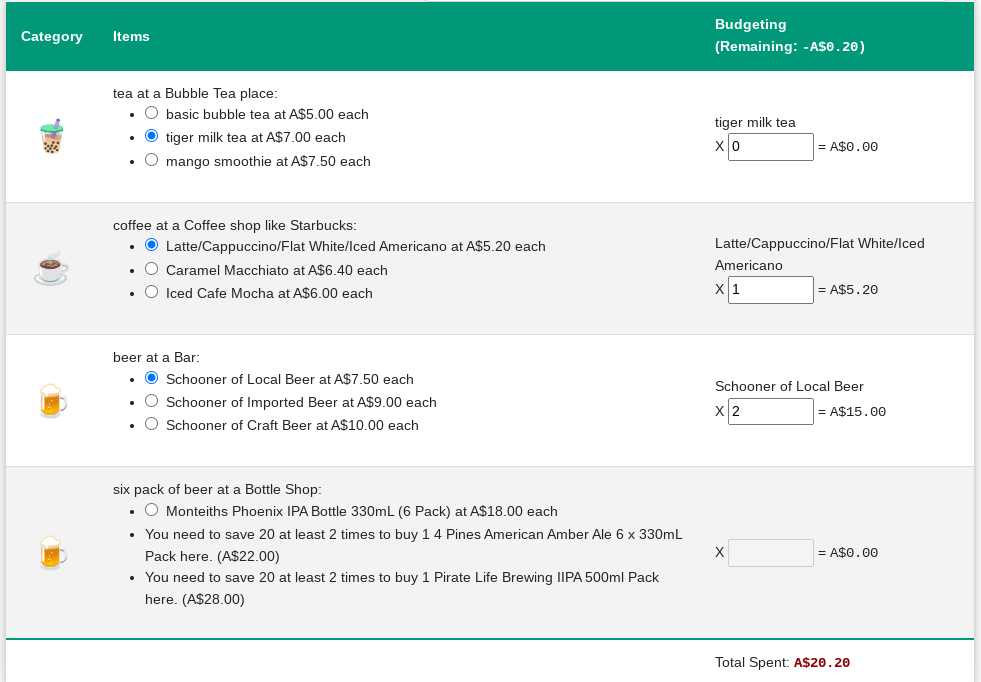 My friend was telling me that he was budgeting for drinks for the month, so I decided to take the same methodology and allow people to use it for calculating their budgets for that category. So you can estimate how many coffees you drink each week or month, how many beers you drink or bubble teas you enjoy and use that to calculate your spending. And of course I disable any options that you can’t afford at all.